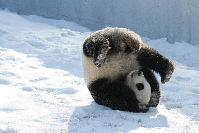Никогда бы не подумал, что панды могут так радоваться снегу! Наверное, их никто не успел надрессировать так с горки кататься, они сами такие умные. А вот интересно: что было бы, если им санки люди дали, — смогли ли бы они на них кататься или нет?