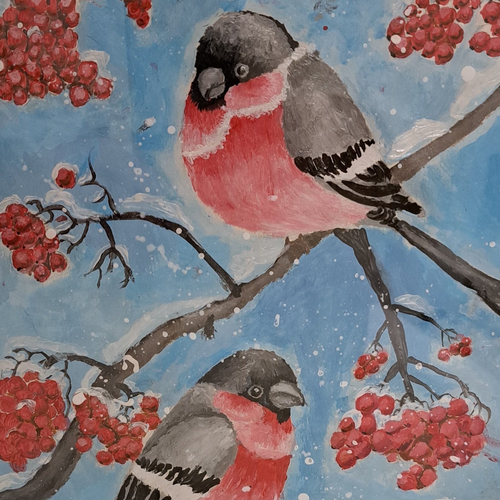 Я нарисовал снегирей, хотя в этих двух произведениях их нет, но эти птицы зимние и очень подошли бы как иллюстрации.