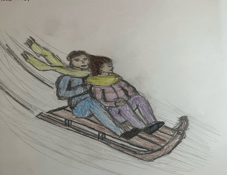 На высокой горе снег блестит под солнцем и трещит под ногами. Я хватаюсь за него своей дрожащей от холода рукой. Мы оба смотрим на санки рядом с нами. Его глаза пристально всматриваются в меня, и нежным голосом он меня умоляет съехать вместе с ним вниз. Я смотрю вниз и начинаю дрожать ещё больше, но уже не от холода, а от страха. Он продолжает умолять. Я бледнею и решаюсь рискнуть. Он аккуратно сажает меня на санки и обхватывает обеими руками. С силой подталкивает санки своей ногой, и мы мчимся вниз со скоростью ракеты. Холодный ветер больно бьёт нас обоих в лицо. И вдруг я слышу признание в любви. Эти слова мне кто-то шепчет прямо на ухо.